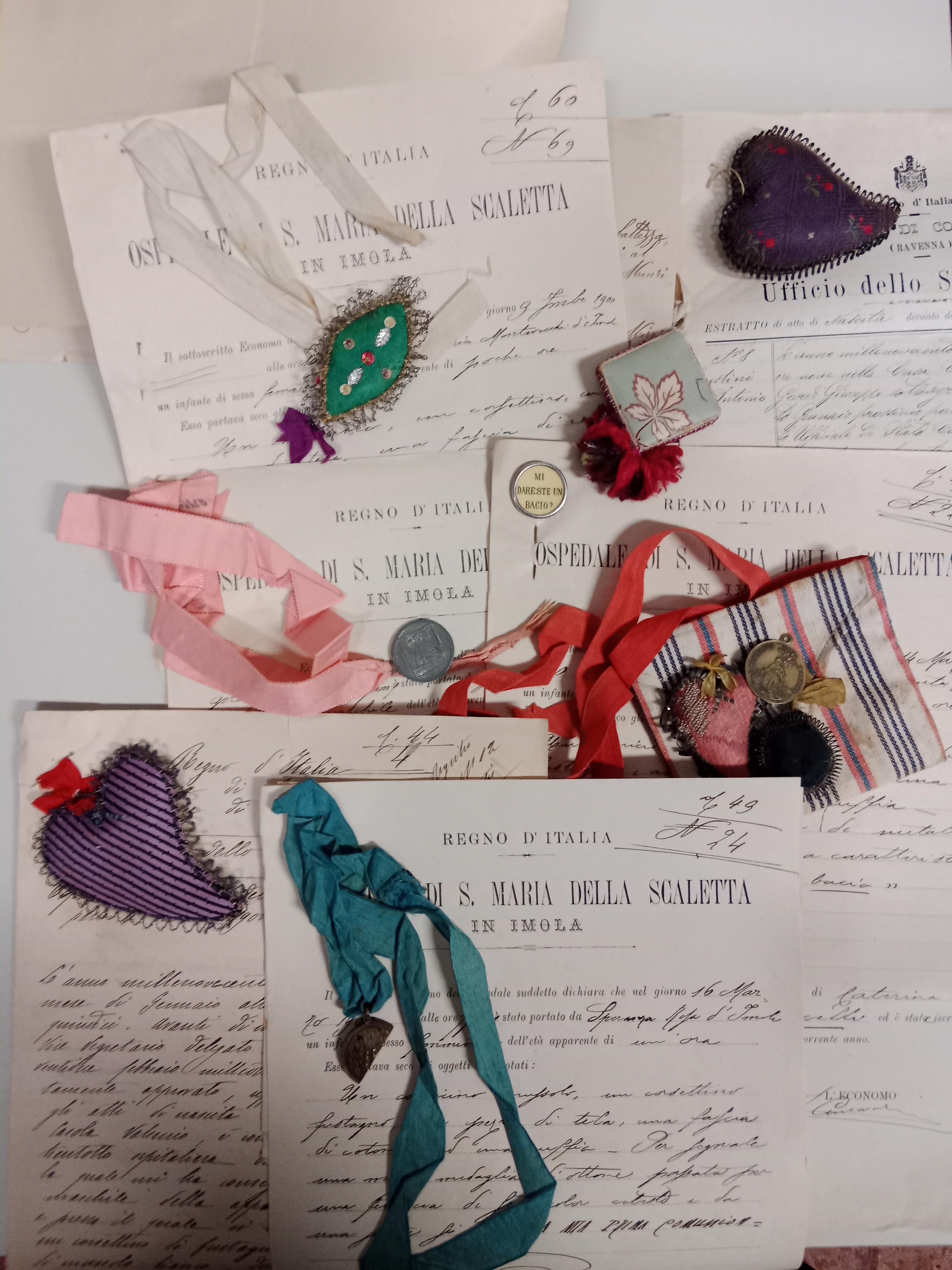 La mostra racconta, attraverso le carte dell’Archivio dell’Ospedale degli esposti di Imola, le storie di neonati legittimi e illegittimi abbandonati all’Ospedale degli esposti attraverso documenti, fotografie e oggetti. Tra la straordinaria documentazione che compone il percorso espositivo si possono ammirare i segni di riconoscimento, oggetti e biglietti manoscritti lasciati tra le fasce dei neonati abbandonati come segno di affetto e di portafortuna, ma anche come elemento di identità, in caso di successivo riconoscimento. Questi segni si conservano tra le carte dell’Archivio degli esposti dalla fine del Settecento e sono oltre 2000. Di questi in mostra ne sono presentati una quarantina.