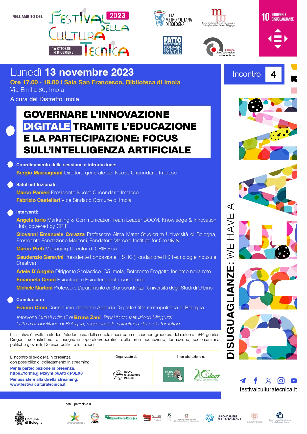 L’evento partirà con l’illustrazione degli esiti di un laboratorio sull’intelligenza artificiale realizzato con 100 studenti e studentesse delle scuole secondarie di secondo grado, per poi aprire un confronto che tratterà, con la presenza di esperti del settore, temi importanti quali l’impatto dell’intelligenza artificiale sulla società e sulle giovani generazioni, e gli effetti sulla cittadinanza e sui diritti.