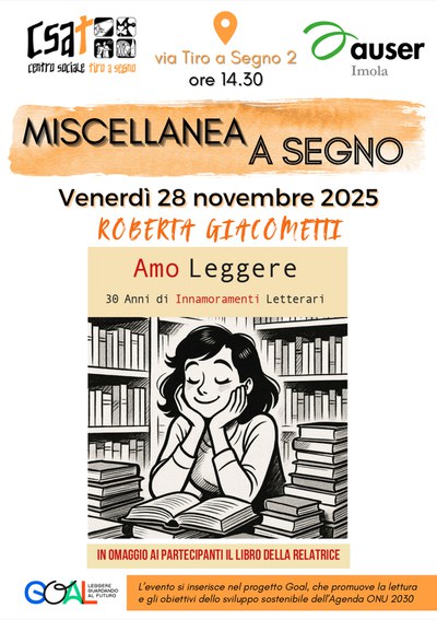 L’evento è realizzato a cura di Auser Imola e Centro Sociale Tiro Segno e si inserisce nel progetto Goal! Leggere Guardando al Futuro, che promuove la lettura e gli obiettivi di sviluppo sostenibile dell’Agenda ONU 2030.